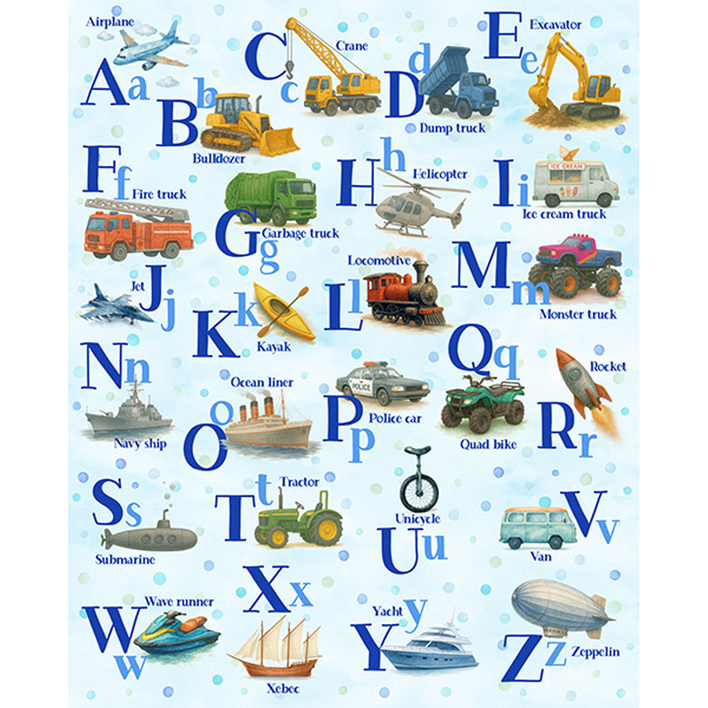 100% Cotton Panel – Things That Go From A to Z (Vehicles Alphabet) – 25742-708 – Baby Blue – Hoffman – 34.25 x 42